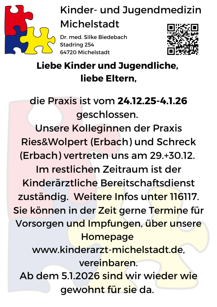 Bitte beachten sie unseren Urlaub (siehe Bild) zwischen den Jahren. Wir Wünschen ihnen ein schönes und friedvolles Weihnachtsfest. Das Team der Kinder- und Jugendmedizin Michelstadt